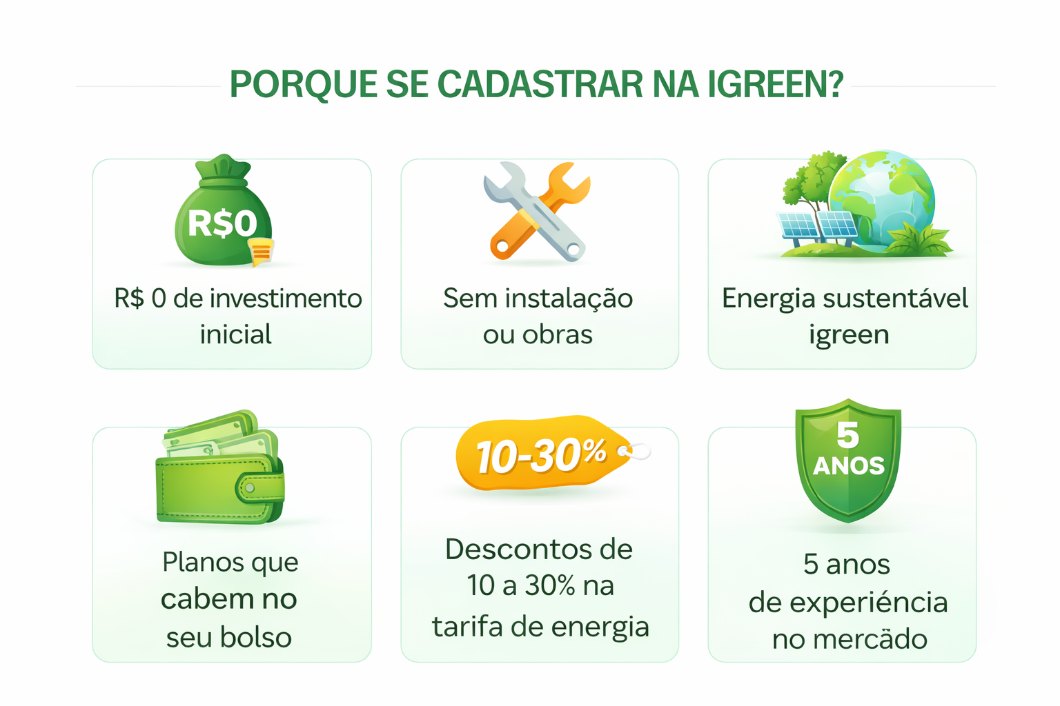 - Cashback sustentável (programa de indicação, ganhe até 100% de desconto na energia injetada pela iGreen indicando amigos e familiares).